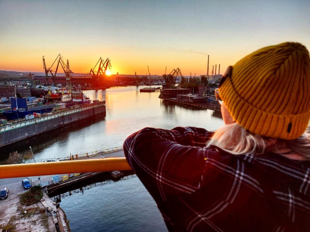 7.Będąc w Gdańsku koniecznie warto pojechać do Stoczni Gdańskiej. Oprócz klimatycznego miejsca z jedzeniem – 100cznia i koncertów na ulicy Elektryków polecam wybrać się również na zwiedzanie Żurawia M3. My byliśmy na żurawiu na ostatnim wieczornym zwiedzaniu przy zachodzie słońca – piękny widok. Wchodzi się tam schodami na górę, więc jeśli ktoś ma lęk wysokości może być ciężko. Sporo osób nie wie o tej atrakcji a naprawdę warto się wybrać.