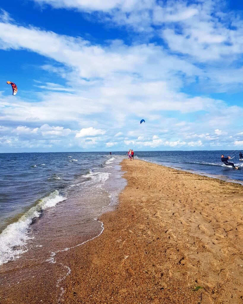 17. Niedaleko Gdyni – Rewa raj dla kitesurferów. Na zdjęciu cypelek w Rewie. Cypel Rewski jest to kilometrowej długości piaszczysta kosa wcinająca się w wody Zatoki Puckiej. Obok Rewy – Mechelinki. Plaża w Mechelinkach często jest wolna od tłumów turystów.