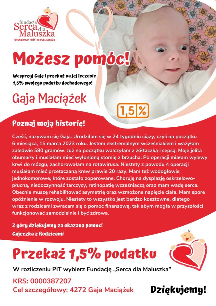 Często sporo osób pyta, jak można nas wesprzeć w sprawach rehabilitacji córeczki. Gaja jest podopieczną fundacji Serca dla Maluszka. Każda wpłata na subkonto córeczki jest dla nas na wagę złota. Wszelkie środki na subkoncie przeznaczamy na rehabilitacje i wszelkich lekarzy, by dążyć do sprawności Gai. Gaja Maciążek | Fundacja Serca dlaMaluszka